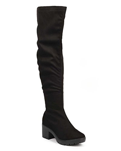Women Suede Thigh High Block Heel Fitted Riding Boot DG18 - Black