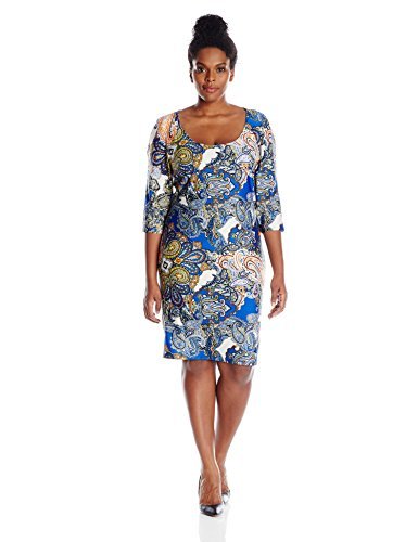 Notations Women's Plus-Size Allover Printed 3/4 Sleeve Cold Shoulder Dress, Royal Sea Magic, 2X