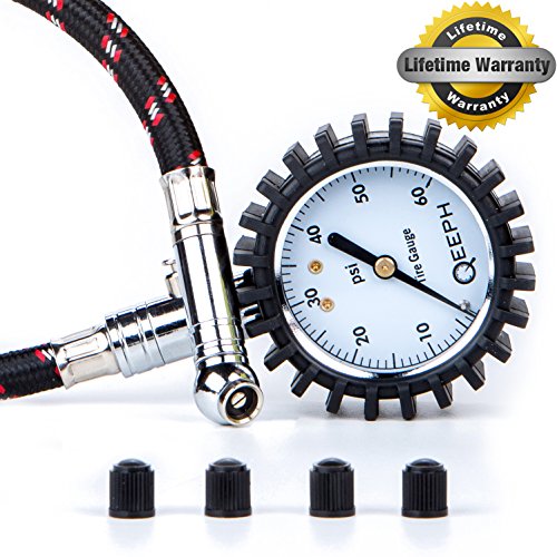 QEEPH Premium Tire Pressure Gauge Flexi (60 PSI) - Large 2" Dial for Readability, Heavy Duty Construction with Rubber Hose - Best For Car, Motorcycle, Bike, RV, SUV - Bonus 4 Free Valve Caps