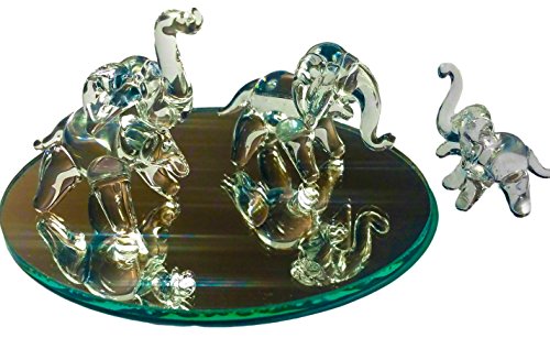 Flame Art Glass Hand Blown Glass Elephant Family Figurines with Beveled Display Mirror, Clear