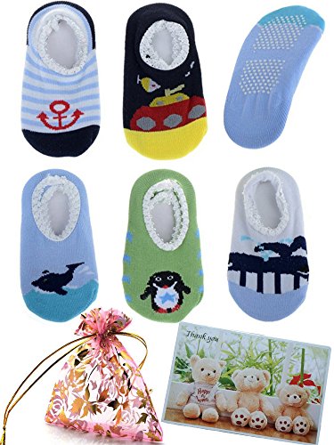 BS® 5 Pairs 6-36 Months Newborn Baby Boys Toddler Anti Slip Skid Slipper foot Socks + Gift bag + Gift Card, Stripes No-Show Crew Boat Socks Footsocks sneakers, Length 9-15cm/3.54-5.9inch