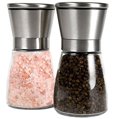 Salt and Pepper Grinder Set - Brushed Stainless Steel Top and Glass Bottle - Salt & Pepper Mill Pair with 5 Adjustable Coarseness Settings and Glass Body - Salt & Pepper Shaker Set By Grindmill