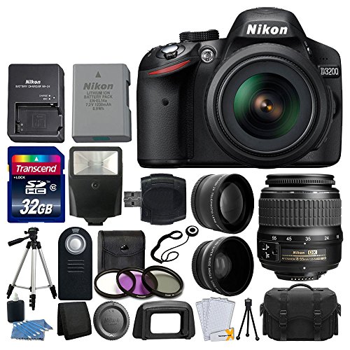 Nikon D3200 24.2 MP CMOS Digital SLR Camera (Black) 18-55mm f/3.5-5.6G ED II AF-S DX Zoom Autofocus Lens + 2x Professional Lens + HD Wide Angle Lens + 32GB Bundle International Version (No Warranty)