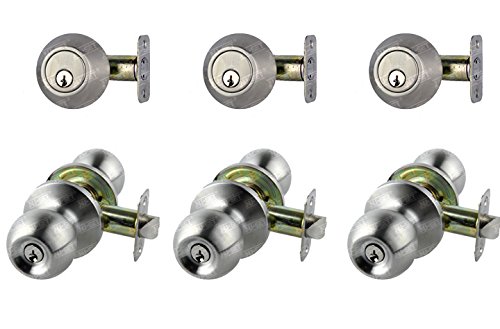 3 Sets of NuSet Fremont(32D) Door Knob and Single Cylinder Deadbolt, Satin Stainless Steel