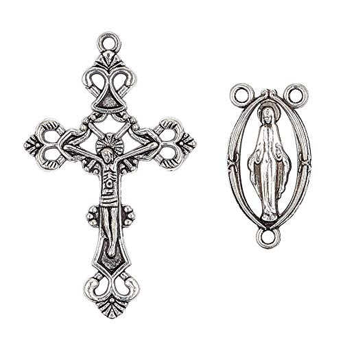Pandahall 10sets Antique Silver Rosary Cross and Center Sets Alloy Crucifix Cross Pendants and Centerpiece Catholic Virgin Links for Rosary Bead Necklace Making