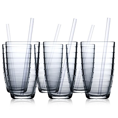 Set of 6 Highball Drinking Glasses with 6 Reusable Acrylic Straws, 16-Ounce, Cocktail, Water, Juice or Beer Glassware set