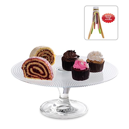 Round Beaded Clear Glass Cake Stand, 11-Inch Vintage Bubble Glass Dessert Cake Plate Serving dish with Plastic Pie Server