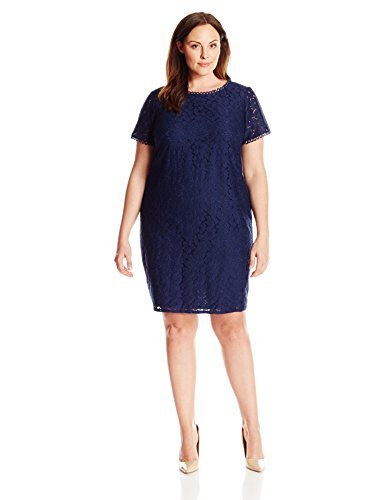 Adrianna Papell Women's Plus-Size Short Sleeve Lace Shift Dress, Navy, 14w