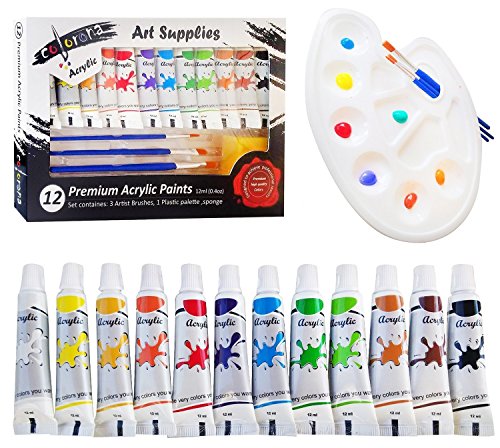 Colorona Acrylic Paint Set with Palette 3 Paint Brushes with Sponge 0.40 oz (12 Colors) for Canvas Rocks Wood Ceramic Fabric and Crafts - Great for Kids, Beginners, Students & Professional Artist