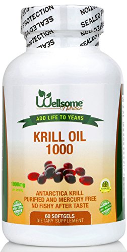Pure Antarctic Krill Oil-Contains DHA & EPA Omega 3s & Phospholipids- Purified & Mercury free - No fishy Aftertaste- 60 Count- By Wellsome Nutrition