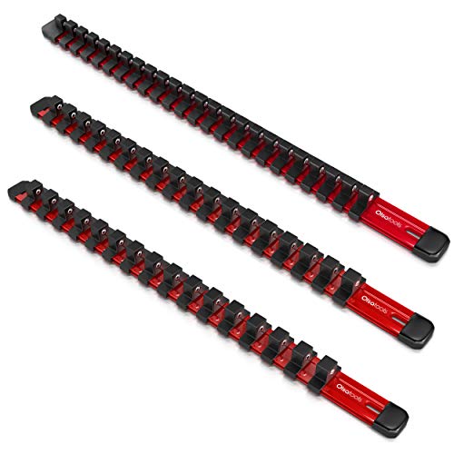Olsa Tools | 3 Pc Set Aluminum Socket Organizer | 1/4-Inch Drive x 24 Clips, 3/8-Inch Drive x 18 Clips, 1/2-Inch Drive x 16 Clips | Premium Quality Socket Holder (RED)