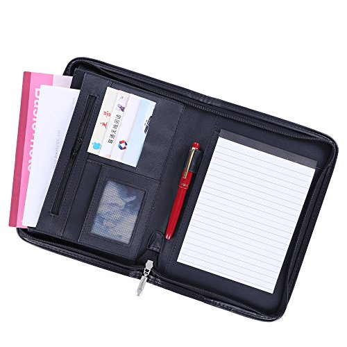 Maxnote Fashion PU Leather Zippered Business Portfolio File Holders Travel Organizer Padfolio Pockets Letter Size Writing Pad Black 267mm*190mm*20mm