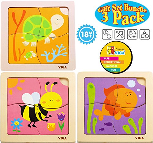 The Original Toy Company Viga 1st Puzzles Gift Set Bundle Featuring Bee, Turtle & Fish - 3 Pack