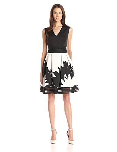 Taylor Dresses Women's Fit and Flare V Neck Scuba Dress Ottoman Skirt, Black/Ivory, 10