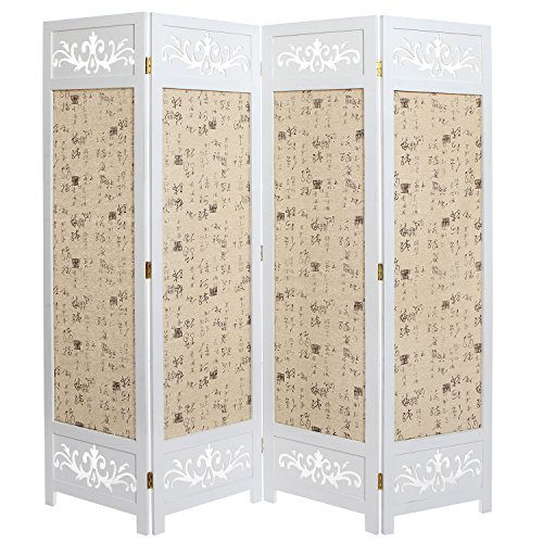 MyGift Asian Oriental Design Large White & Beige Wooden 4 Panel Folding Room Divider/Indoor Privacy Screen