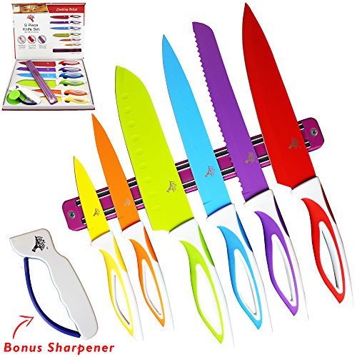 Colorful Kitchen Knife Set Sharp Cooking Cutting Knives by Ledish - Professional Colored Chef, Bread, Slicer, Santoku, Utility, Paring Knifes Sets - with Magnetic Strip, Sharpener, Brush, in Case.