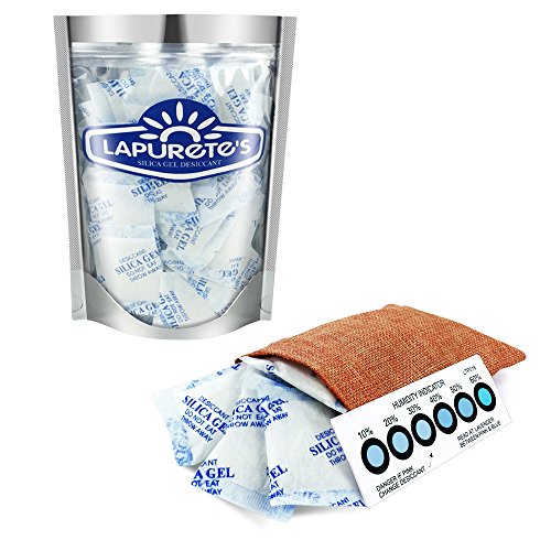 Lapurete’s 25 × 10 GramSilica Gel Packs Desiccant Dehumidifier(Regenerative) Dries Clothing, Shoes, Medications, Foods. 3 Complimentary Humidity Indicator Card & Storage Bag