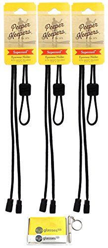 Eyeglass Retainer & Sunglass Holder By Peeper Keepers Supercord Adjustable, Black, 3pk | w/Microfiber Cloth, Screwdriver
