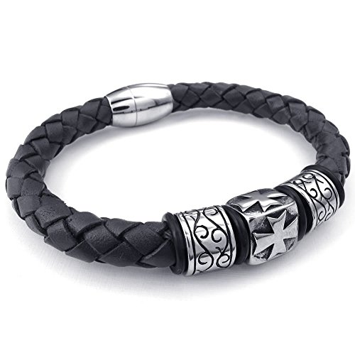 KONOV Mens Leather Stainless Steel Bracelet, Cross Charm Magnetic Clasp, Black - 8, 8.5, 9 inch