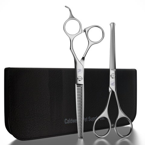 Caldwell's Long and Short Haired Cat and Dog Grooming Scissors - Set of Two - 1 Pair Pet Thinning Shears with 1 Pair Round Tip/Ball Tip Safe Edge Trimming Shears - Stainless Steel