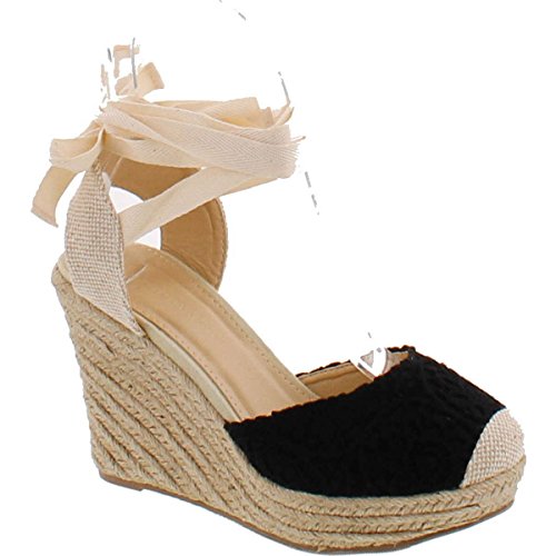 Wild Diva Maegan-32 Women Floral Crochet Ankle Wrap Slingback Espadrille Wedge - Black,Black,9
