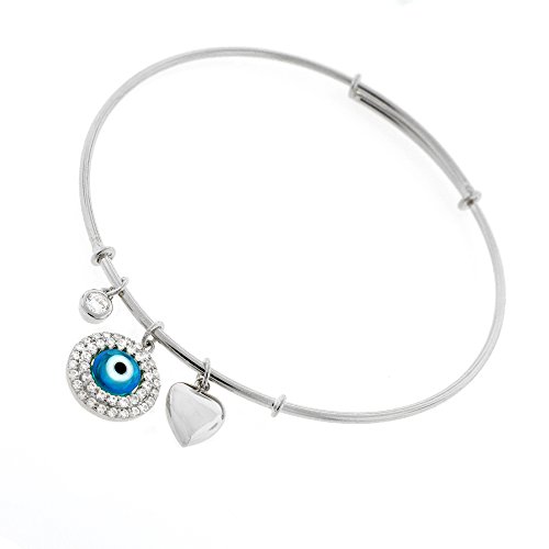 .925 Sterling Silver Womens CZ Evil Eye Charm Bangle Bracelet 7.5" Expandable