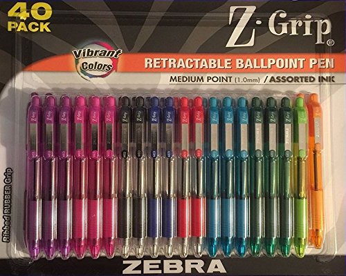 Zebra Z-Grip Retractable Ballpointe Pens Medium Point 1.0mm 40 Count, 9 Assorted Colors