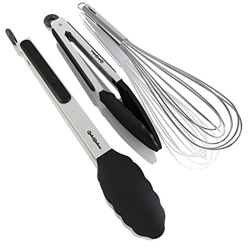 GuteKüchen Kitchen Tongs & Stainless Steel Whisk Set | 2 pcs Silicone Pinches with Locking Clip (9 Inch and 12 Inch) | Premium Balloon Wire Whip Tool (Black)
