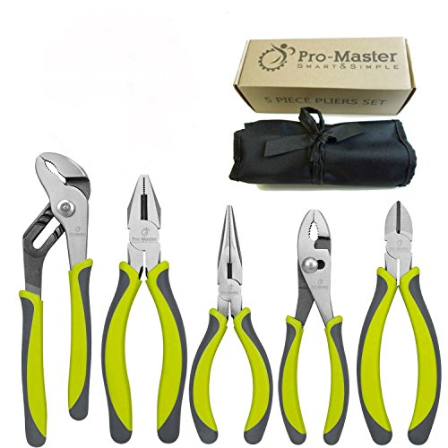PLIERS SET - Best Men 5 Pc Plier Kit. FREE Handy Tool Roll Case Organizer. Slip Joint, Diagonal Cutting, Long Nose, Lineman, Groove Joint. Confort, Rubberized, NoSlip Grips. Lifetime MB and Warranty