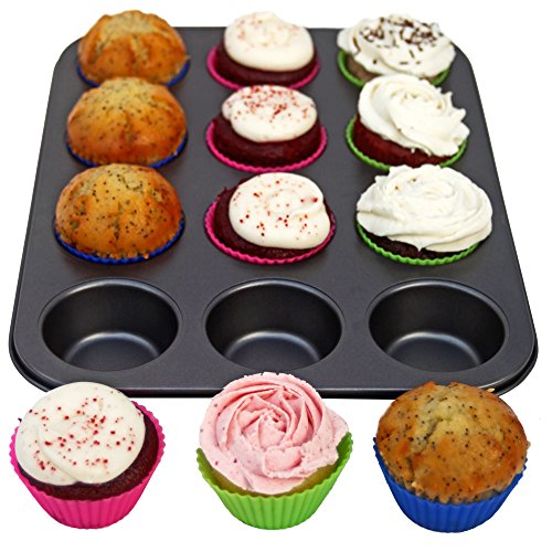 Nonstick Muffin Pan 12 Cup + 12 Removable Silicone Cupcake Holders. Premium Cupcake Pan + Cupcake Baking Cups are Dishwasher Safe & Microwave & Freezer Safe. So Easy to Clean. Best Baking Results!