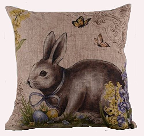 Cotton Linen Square Decorative Throw Pillow Case Cushion Cover Happy Easter Retro Smile Rabbit Color Egg and Butterflies 18 "X18 " (1)