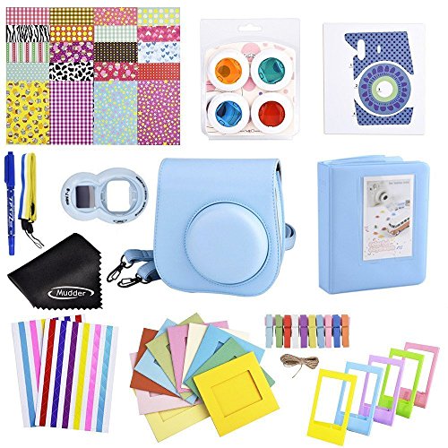 Mudder 11 in 1 Camera Accessory Bundles Set for Fujifilm Instax Mini 8 (Mini 8 case/ Sticker/ Album/ Hang Frames/ Film Frames/ Sticker Borders/ Border Stickers/ Lens/ Filters/ Strap/ Pen) (Light Blue)
