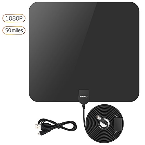 AuYou Ultrathin Indoor Amplified HDTV Antennas - 50 Mile Range with 16ft Highest Performance Coax Cable (Black, AN-HDTV009)