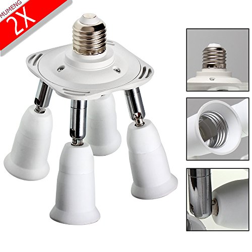 MUMENG 2PC E27 to E27 4 in 1 Bulb Lamp Light Socket Adapter 4 Way Splitter E27 LED Light Socket Splitter Universal Head 360 Degrees Adjustable , 180 Degree Bending White