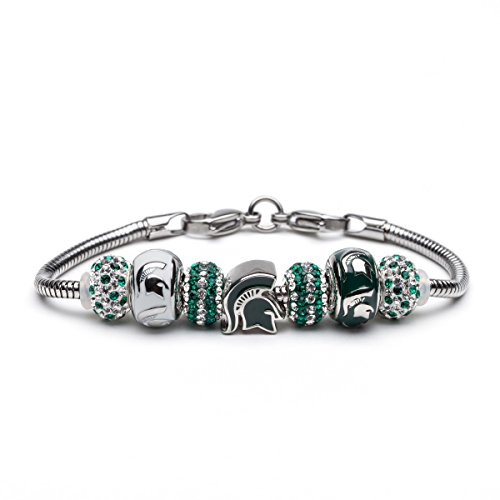 Michigan State Bracelet | MSU Spartans Charm Bracelet with 3 Spartan Charms and 4 Crystal Beads | Officially Licensed Michigan State University Jewelry | Michigan State Gifts | Stainless Steel