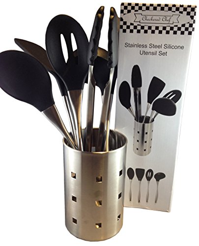 Checkered Chef Stainless Steel and Silicone Kitchen Cooking Utensil Set with Metal Holder, Six Piece Set