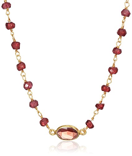 Garnet Bezel Pendant on Gold Over Silver Linked Garnet Beads Chain Necklace, 17"