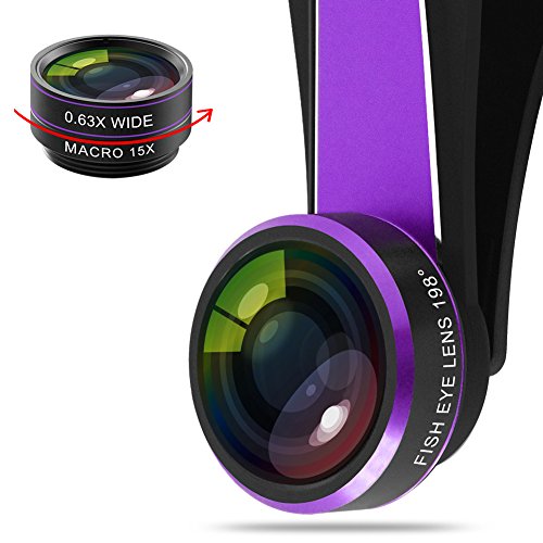 3 in 1 Cell Phone Camera Lens Kit-198 Degree Super Fish Eye + 0.63X Wide Angle + 15X Macro Lenses + Universal Clip for Apple iPhone 6S/6/5S/iPad/Android and Other Smartphones (Purple)