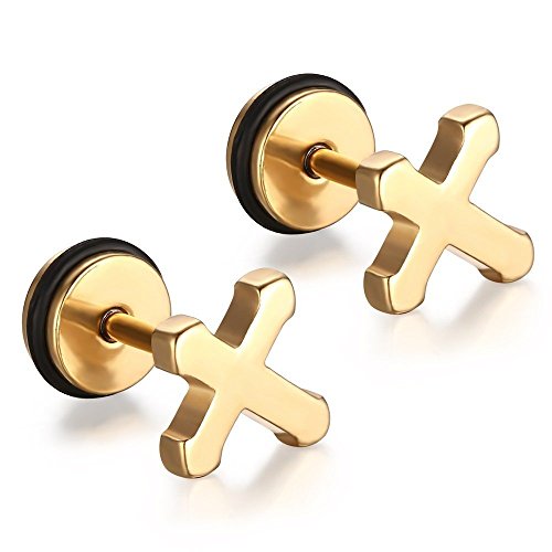 Vnox Jewelry Mens Stainless Steel Gold Plated Small Cross Stud Earrings with Screw Back