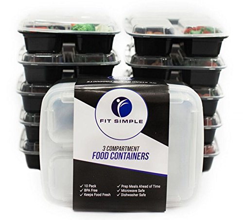 (10-Pack) Fit Simple Stackable Meal Prep Containers - 3 Compartment Bento Box with Lid - Portion Control, Lunch Food Storage, BPA-Free, Reusable, Microwavable. INCLUDES 7 FREE Recipes.