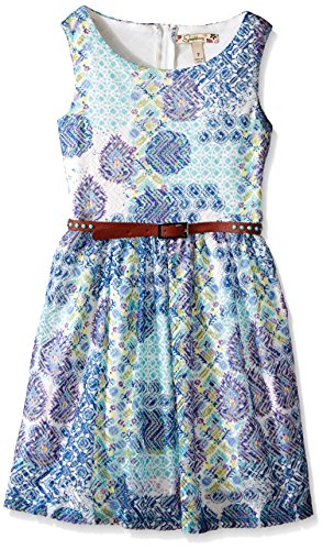 Speechless Big Girls Printed Lace Knee Length Sleeve Less Boat Neck Side Zipper, Blue/Lime, 16