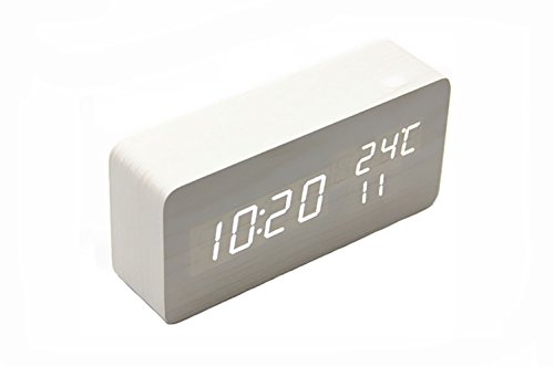 Smileto Creative Voice Sound Activated Wood LED Digital Alarm Wooden Clock with Time, Week, Month Display and Hour, Minute, Seconds Temperature Display (White case white light)