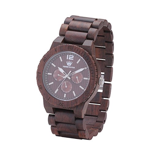 LingAo Handcrafted Mens Wooden Watch Luxury Style Made With Natural Sandalwood+Day Date Calendar Sandalwood Round Quartz Wood Watch (W1 Chocolate)