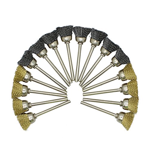 AUTOTOOLHOME Pack of 16 Brass and Stainless Steel Bristle Cup Shape Wire Brush 1/8" Shank for Dremel Rotary Tools