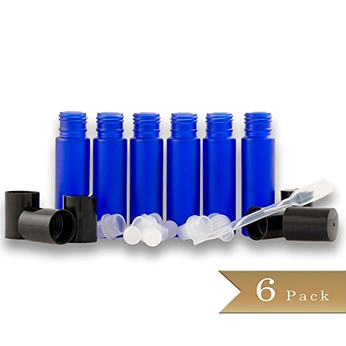 Set of 6 - TrueCraftware .35 Oz / 10 ml Frosted Cobalt Glass Roll On Bottles with Black Caps and a Bonus Dropper Pipette