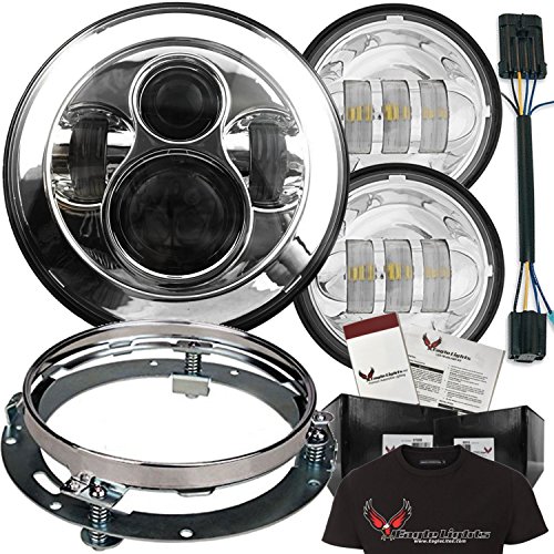 Eagle Lights 7 inch Round LED Headlight Kit with Matching Passing Spot Lights, Adapter Ring, Adapter Plug and Free T-Shirt for Harleys (Chrome)