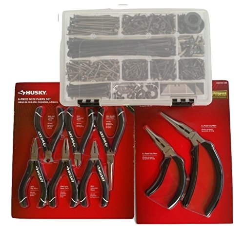 Husky 9 Piece Pliers Bundle: 6 Pieces Mini Pliers and 2 Piece Pistol Grip Pliers Set with Bonus 11 Inch Parts Bin Organizer
