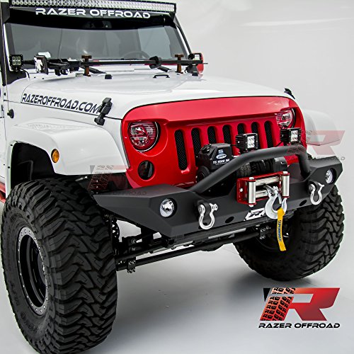 Razer Auto Black Textured Rock Crawler Front Bumper with OE Fog Light Hole, 2x D-Ring and Built-In Winch Mount Plate for 07-18 Jeep Wrangler JK