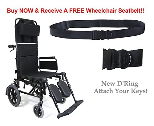 Karman Healthcare KM5000F16B-MS 24 Inches Rear Wheels and 16 Inches Seat Width, Aluminum Lightweight Reclining Wheelchair, Black, Fixed Wheel & FREE Black Wheelchair Seatbelt!
