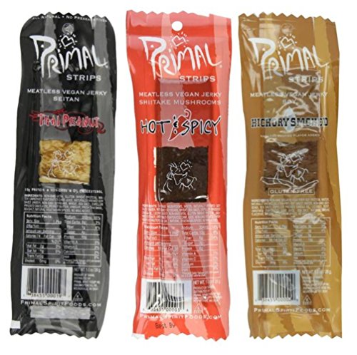 Primal Spirit Meatless Vegan Jerky 3 Flavor 6 Strip Variety Bundle: (2) Primal Spirit Thai Peanut, (2) Primal Spirit Hot & Spicy, and (2) Primal Spirit Hickory Smoked, 1 Oz. Ea. (6 Strips Total)